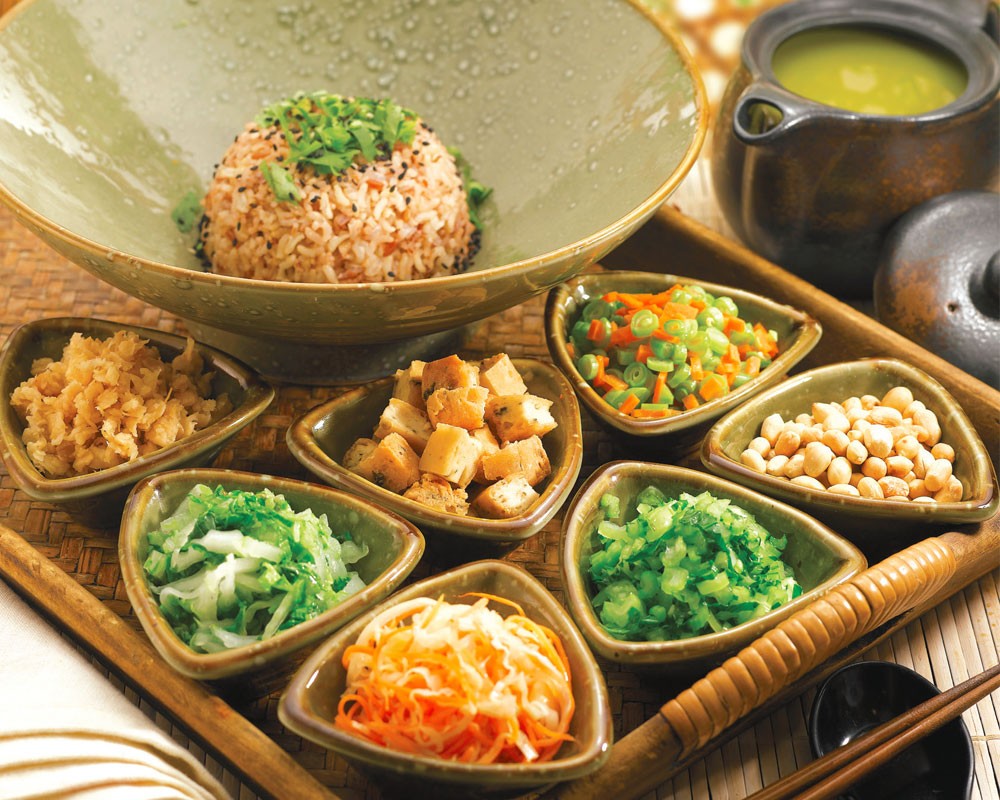 Lei cha, signature of Simple Life, is a traditional nutrient-rich Hakka tea-based beverage or gruel. The soup is a concoction of pounded tea leaves, basil, mint and herbs, rich in nutrition and good for health. Served together with soup are peanuts, french bean, cabbage, carrot, dry raddish, fresh vegetables, beancurd and multi grain rice.
